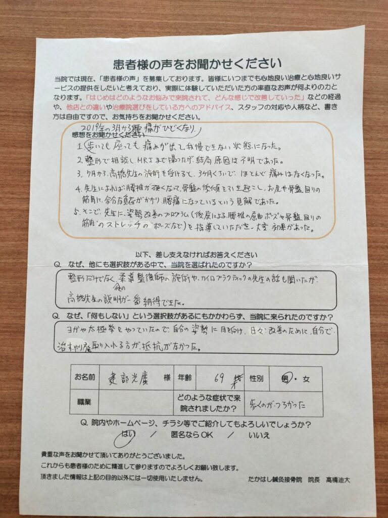 この方のように、「自分で治す」と覚悟を決めていただければ、腰痛はそんなに難しくなく良くなります。
