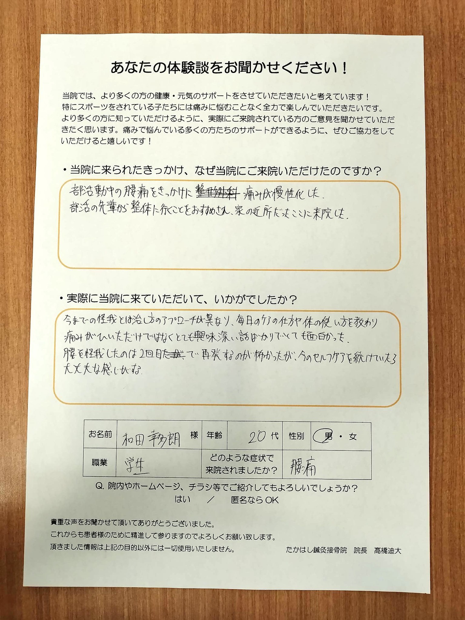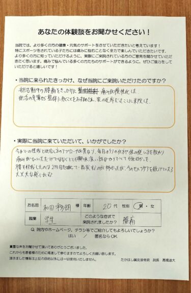 部活動中の腰痛をきっかけに痛みが慢性化した。部活の先輩から整体に行くことをおすすめされ、家の近所だったここに来院した。