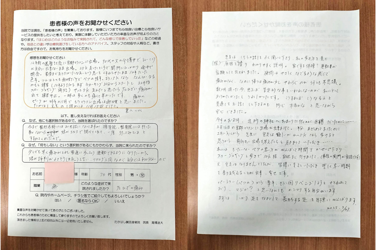 70代にして、12年ぶりのマラソン(ペア)挑戦と聞き、絶対に走り切っていただこうと思いました。整形外科やリハビリにも通われていましたが、どんどん膝の痛みが悪化してきて、とうとう歩くことすらも痛みで辛いという状態になり、当院にご相談に来られました。