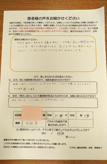 知り合いの紹介で、トレーニング指導をしていると聞いてくるようになりました。しっかり治療もしてもらえるので、そのまま通っています。