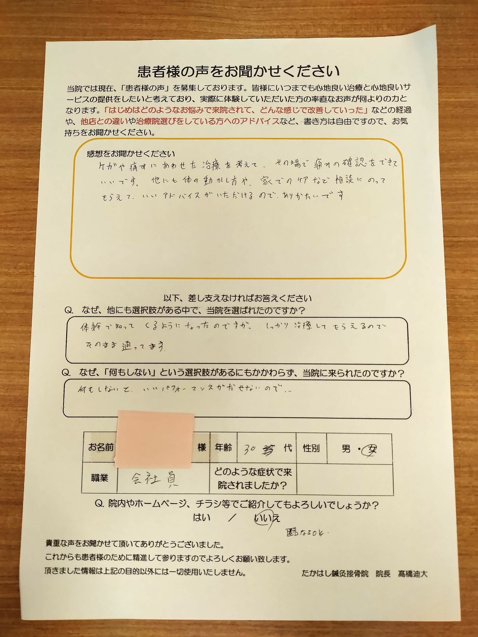 ケガや痛みに合わせた治療を考えて、その場で痛みの確認を出来て、良いです。他にも体の動かし方や、家でのケアなど相談にのってもらえて、いいアドバイスがいただけるのでありがたいです。