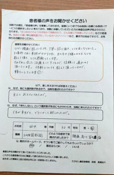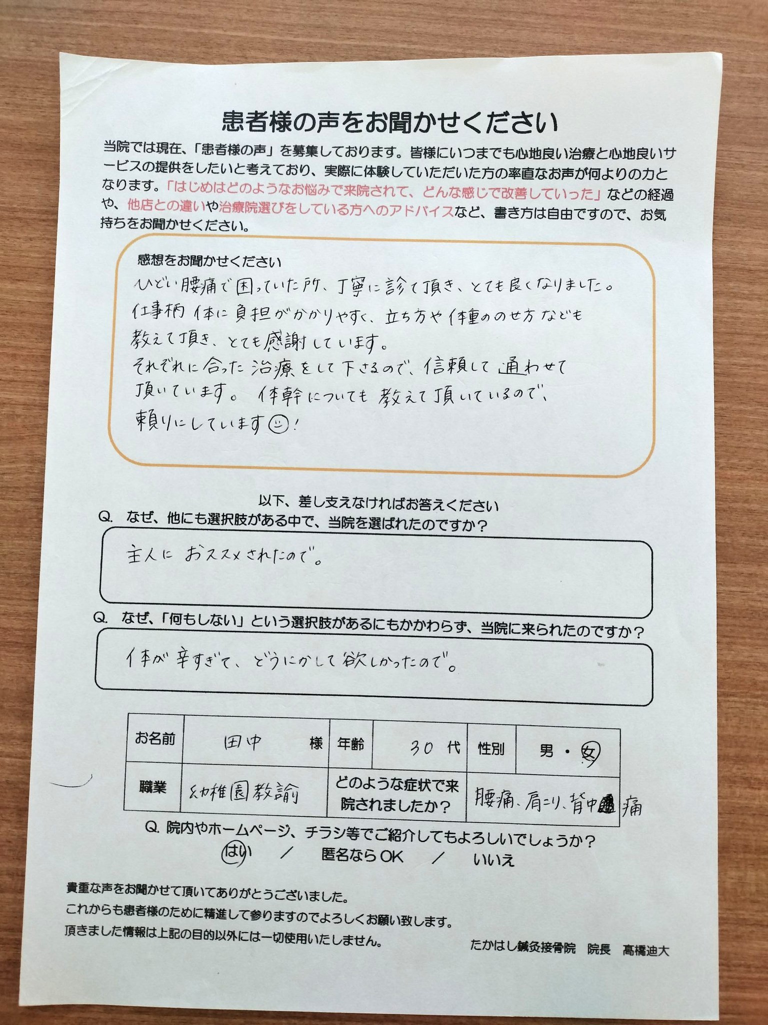 ひどい腰痛で困っていた所、丁寧に診ていただき、とても良くなりました。仕事柄(幼稚園教諭)、体に負担がかかりやすく、立ち方や体重ののせ方なども教えていただき、とても感謝しています。