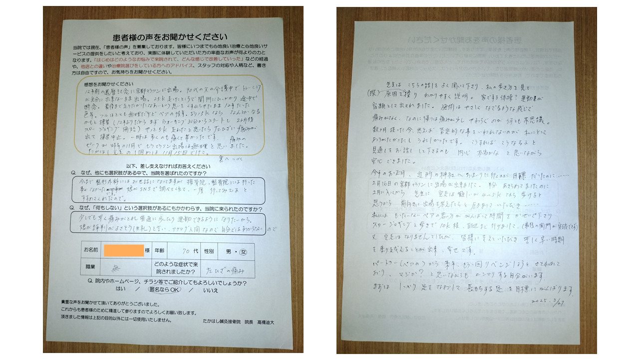 途中、旅行に行き、膝の痛みが悪化してしまったこともありましたが、気持ちの浮き沈みもある中でも、宿題を続けていただけた結果、マラソン当日には膝が痛くならずに走れるようにまでなれました。